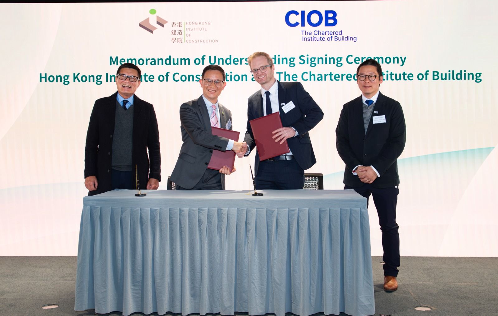 It was witnessed by executive director of the CIC Ir Albert Cheng, and chair of CIOB’s Hong Kong Hub Committee Kelvin Choi MCIOB.