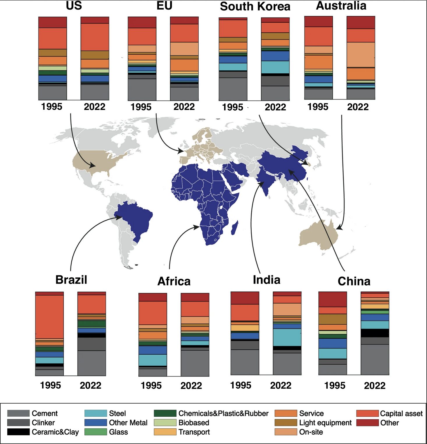 The report notes that the emissions for construction materials in developed regions has remained relatively stable when compared to developing regions, with China’s carbon footprint increasing from 43% to 73% between 1995 and 2022, and Brazil’s reaching 57% from 28% (see image below).