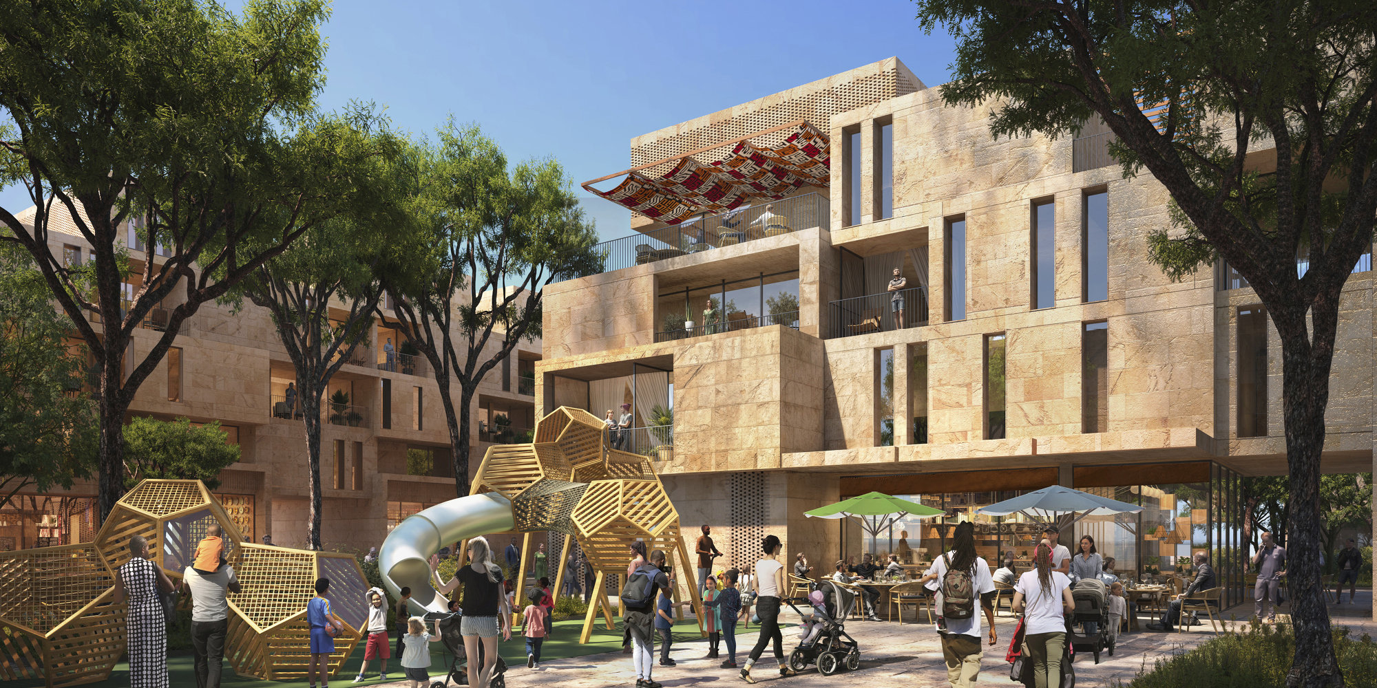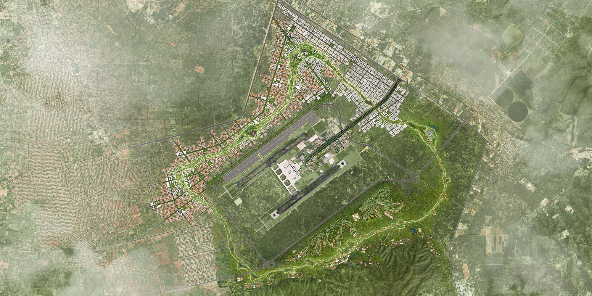 The development’s urban grid will be aligned with the airport’s runways and prevailing wind to increase natural ventilation and reduce temperatures. 3-sq-km of photovoltaic panels will be placed alongside the airport’s runways.