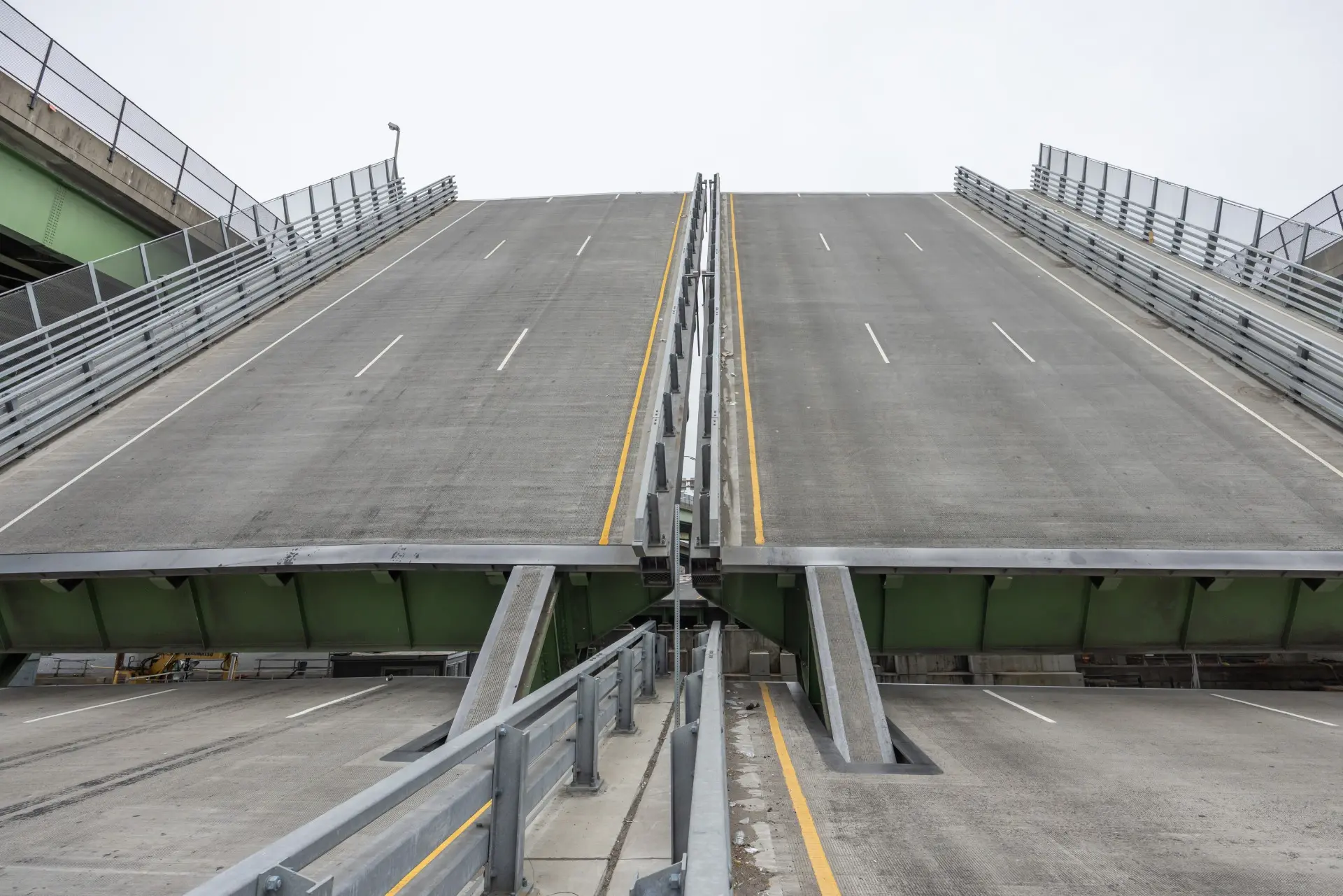 The new $232m bridge replaces the original 1950s-era structure and contains two side-by-side, single-leaf bascule spans, each with three lanes of traffic and a dedicated pedestrian walkway and bike lane.