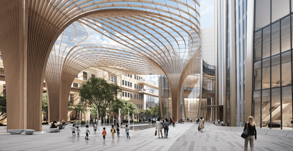A five-storey podium contains event space and is linked to the district’s existing civic hubs by interconnected pedestrian plazas, courtyards and walkways.
